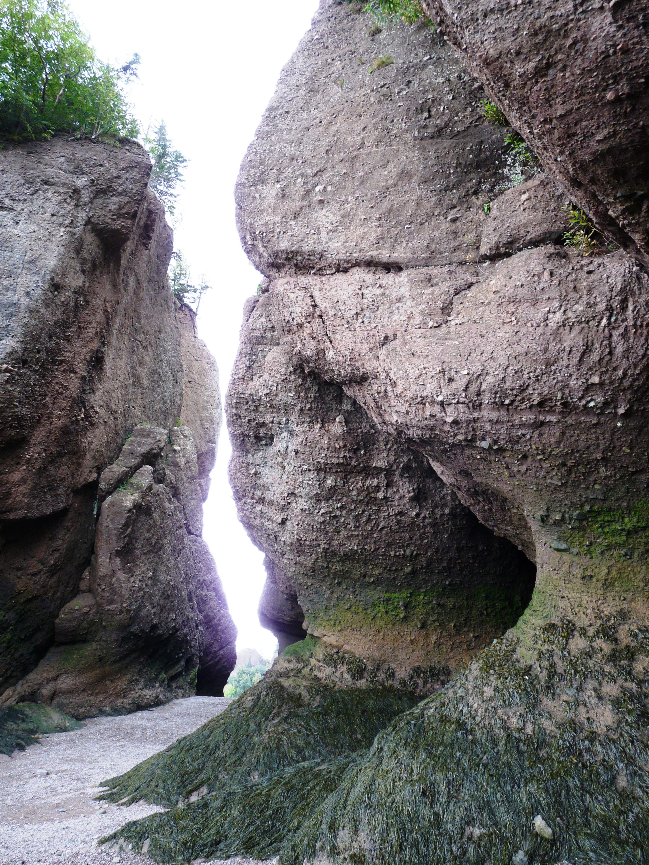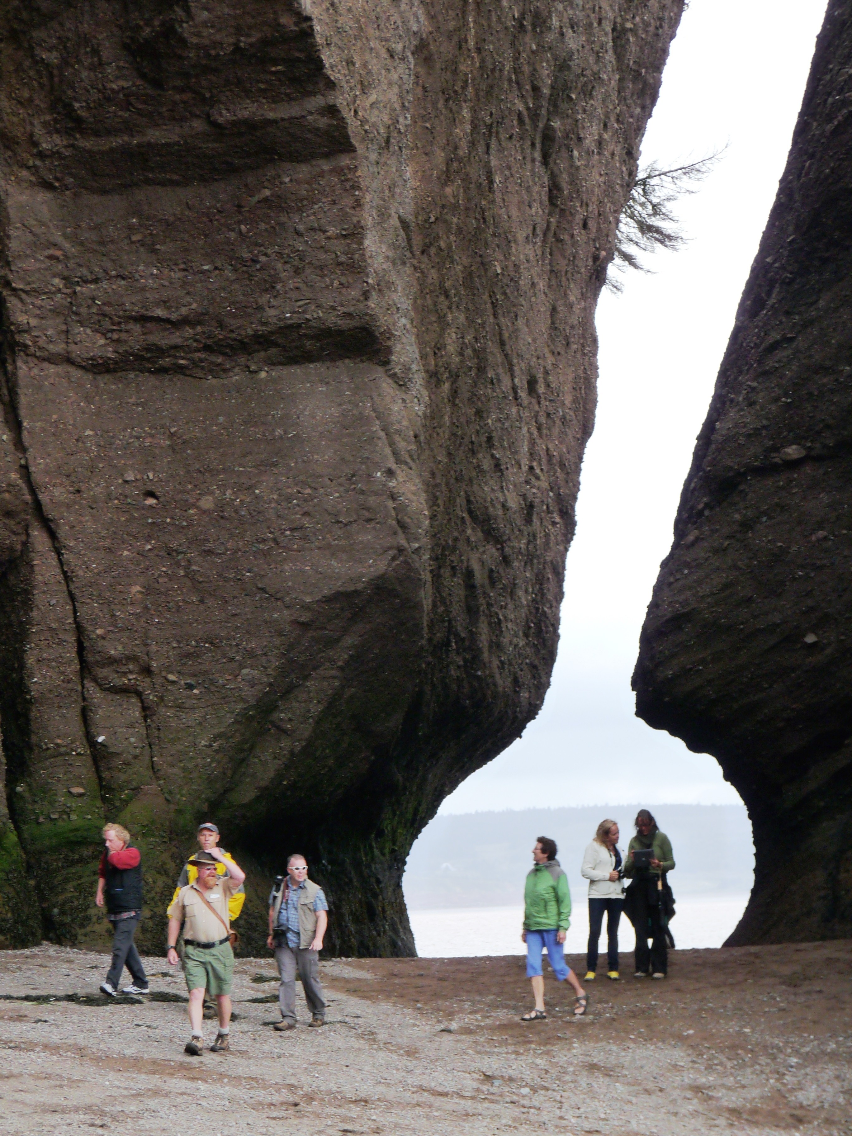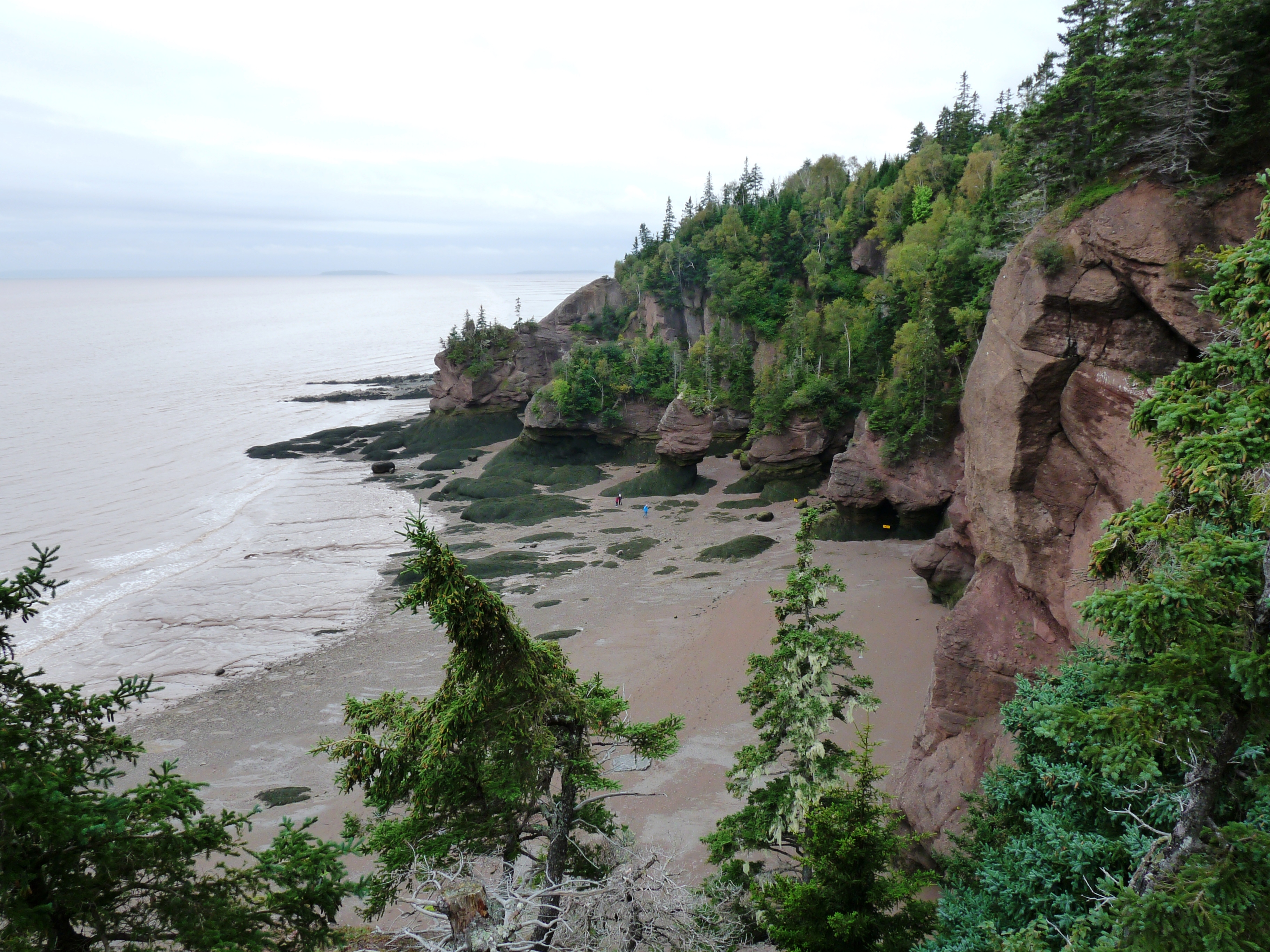 A quarante kilomètres de Moncton, au Nouveau-Brunswick, la rivière Petitcodiac se jette dans la baie de Shepody au fond de la longue baie de Fundy. Le site des Rochers Hopewell vaut absolument le détour à marée basse. Du centre d’interprétation, il faut descendre sur un sentier pour atteindre la plage nichée dans une anse. De là, on longe les falaises et d’impressionnants rochers « pots de fleurs » aux formes bizarroïdes érodées par la pluie, le vent, les glaciers et les marées qui sont ici parmi les plus fortes au monde (17 mètres d’amplitude). Raison principale : l’eau qui s’engouffre dans la baie de Fundy comme dans un entonnoir. La baie – bras du golfe du Maine – est en effet large et profonde à son embouchure, tandis qu’au fond, elle l’est beaucoup moins. Le grès rouge de la côte échancrée est très friable et il faut prendre garde à ne pas passer trop près.