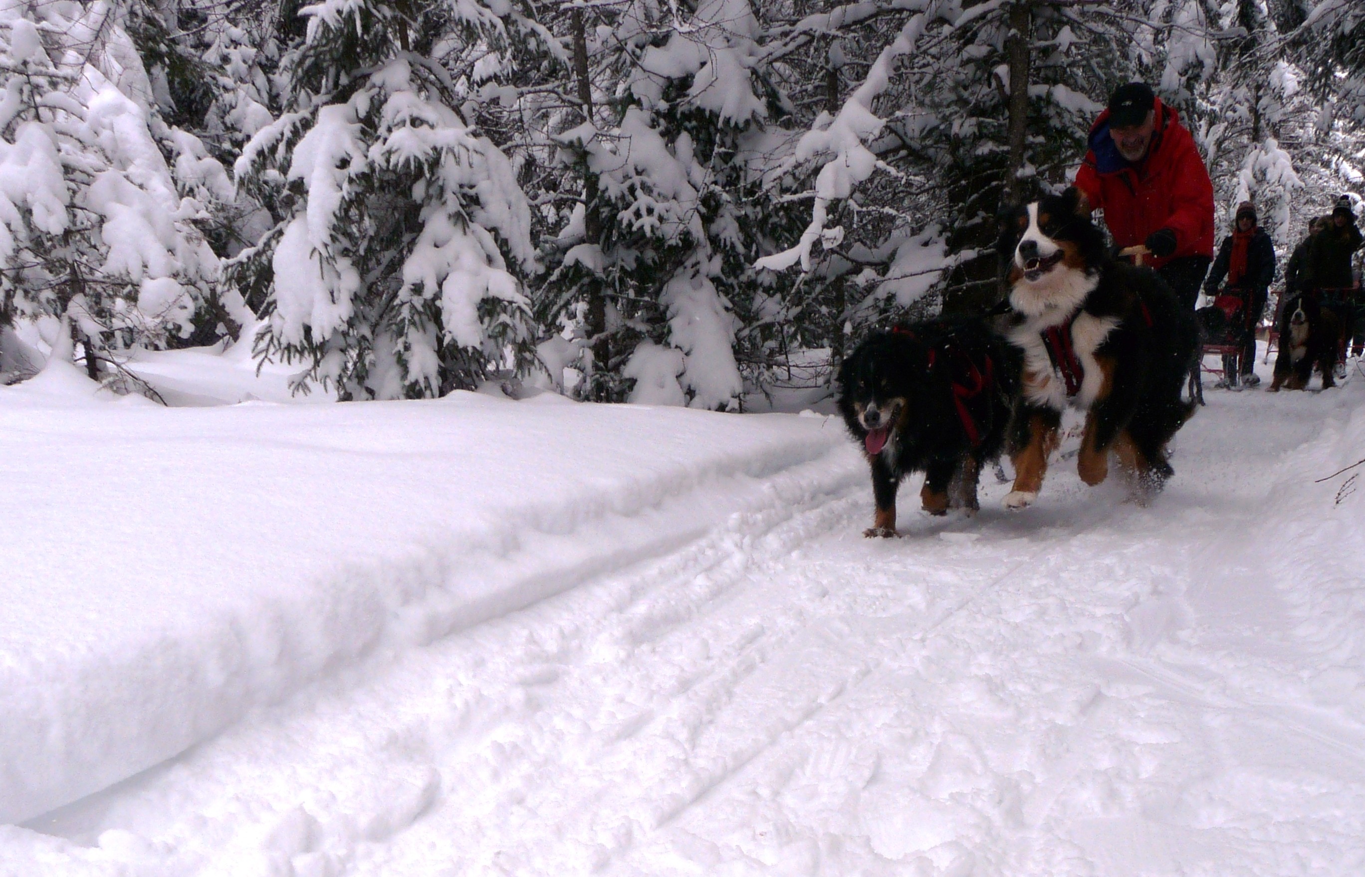 C’est l’un des nouveaux sports d’hiver à la mode au Québec: la trottinette des neiges tirée par un chien « normal ». J’ai testé la chose le week-end dernier dans le parc régional des Appalaches (région de Chaudière-Appalaches) sur neige fraîche. Les beaux pitous vaillants (surtout des bouviers bernois réputés pour leur endurance) tiraient la langue. Et nous devions patiner allègrement pour les aider, même sur terrain quasi-plat. Un excellent exercice cardio-musculaire (cuisses-fessier) ! En phase de récupération (tous les 500 mètres), voyez les chiens à l’œuvre sur la photo ci-dessous… J’ai résumé l’essai en un « mini-traîneau à chiens » avec certes moins de défis que le vrai avec chiens puissants type Husky, en terme de vitesse (bienvenue aux adeptes de la glisse lente) et de conduite de traîneau (moins sportive dans les virages) mais pour la dépense physique, le partage est plus égal entre patineur et chien, parole de testeuse ! On pourrait aussi appeler ça de la patinette sur neige quoique qu’on puisse bien trotter pour ne pas trop fatiguer les toutous.