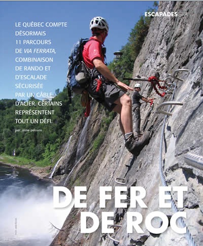 Dans le numéro de juillet/août 2014 de Géo Plein air, vous pourrez lire deux de mes reportages. Le premier vous propose cinq parcours différents de via ferrata dans quatre régions du Québec : en Mauricie, dans Charlevoix, dans les Laurentides et dans la région de Québec.