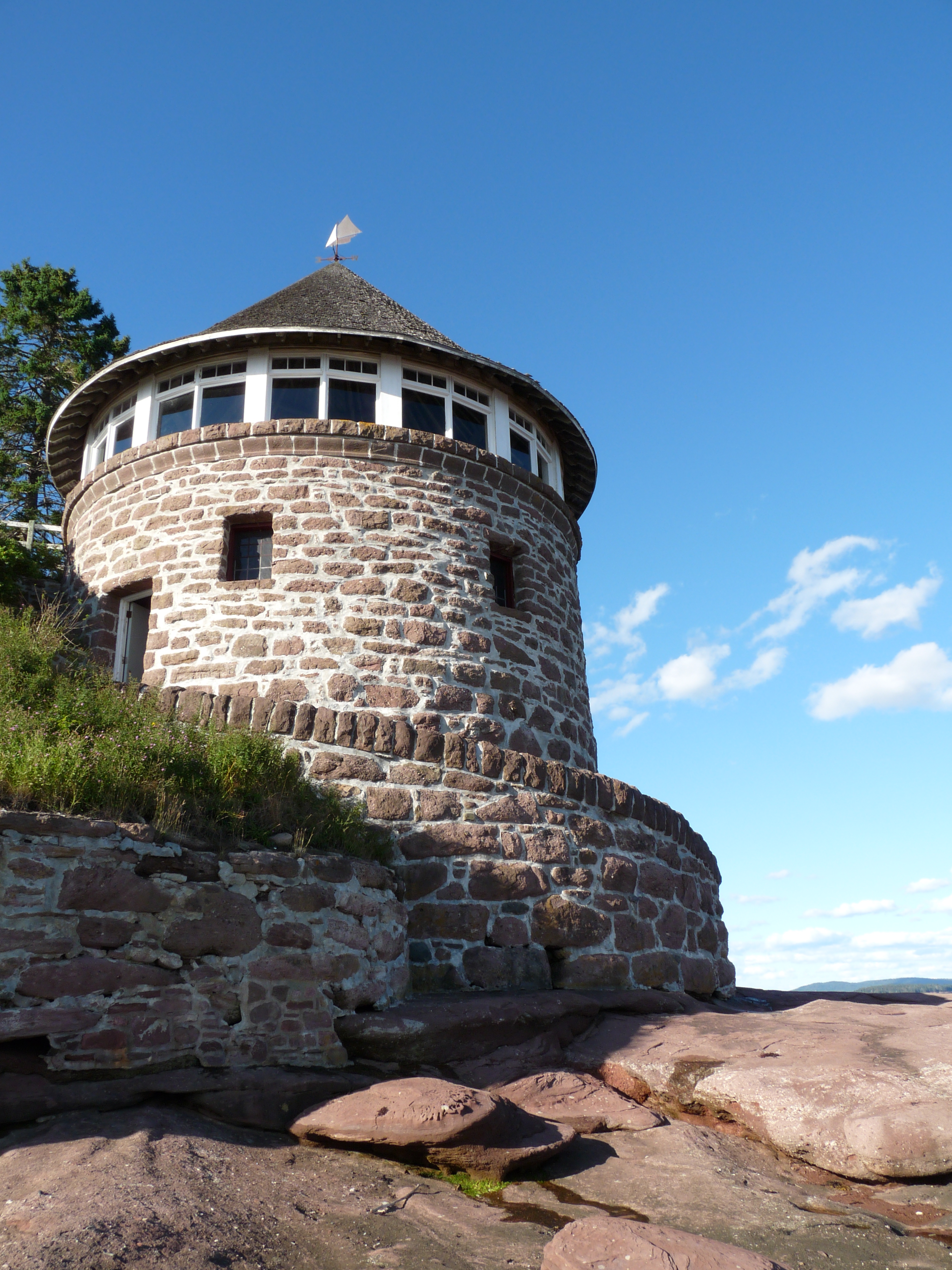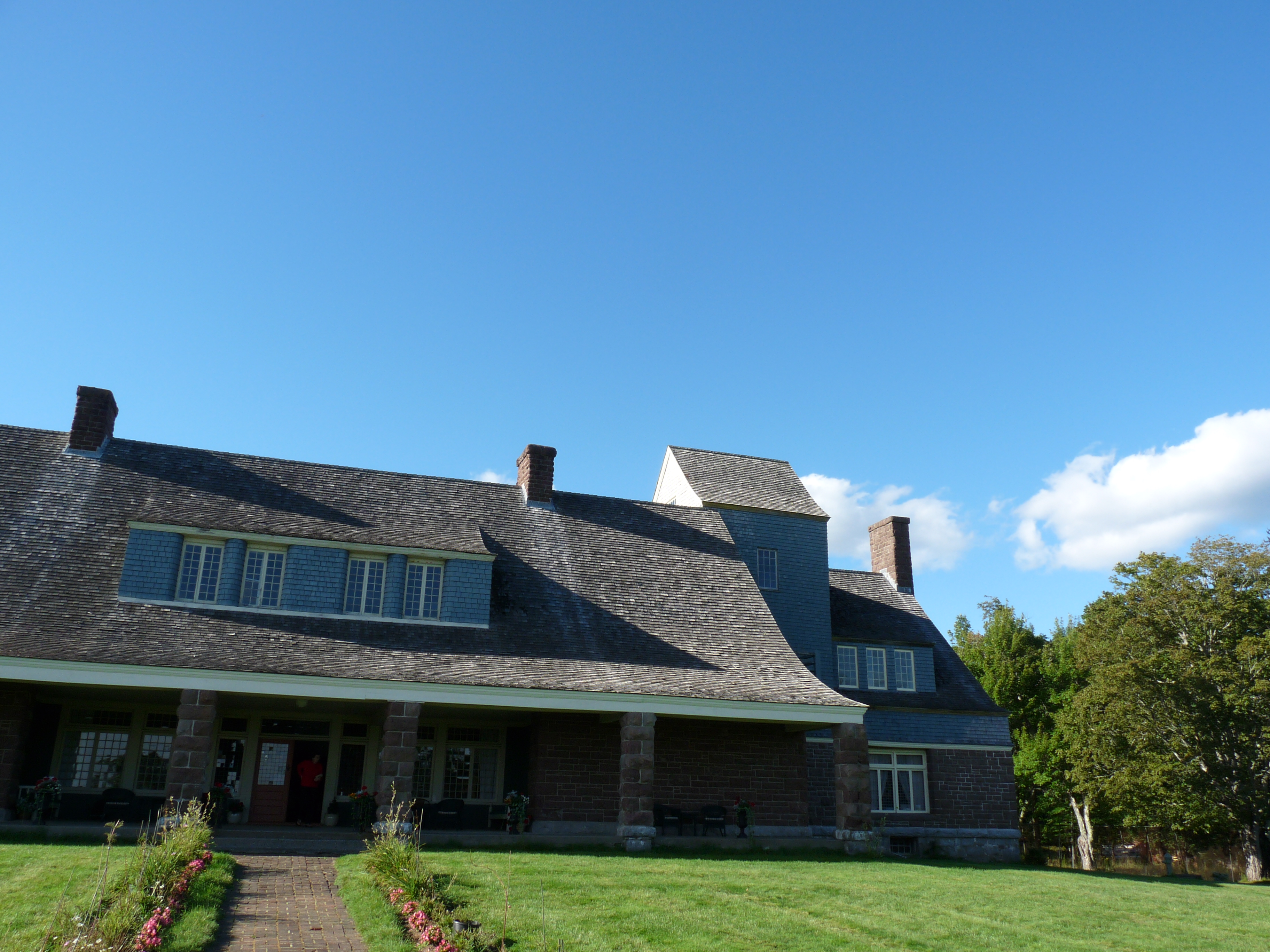 On comprend que le riche William Van Horne ait fait de cette île sauvage son lieu de vacances estivales à la fin du 19ème siècle. Accessible seulement à marée basse à pied ou en voiture via un banc de gravier de 500 mètres environ, l’île séduit par sa nature autant que par son histoire, intimement liée à celle de celui qui fut chargé par le Canadien Pacifique de la construction du rail entre Montréal et Vancouver ! L’homme fit érigerune résidence de 50 pièces sur Ministers Island pour y passer ses vacances avec famille et amis. Passablement décrépie de l’intérieur, la Résidence Covenhoven a beaucoup de charme de l’extérieur, comme en ont ses .jardins et sa « cabine » de bains, jolie construction ronde au-dessus des rochers de la baie de Fundy, où l’on pouvait se changer avant d’aller plonger dans une piscine naturelle d’eau salée. Dans la maison qui domine la baie de Passamaquoddy sont accrochées de nombreux tableaux signés Van Horne. Peintre prolifique, il est a mon goût meilleur en « huile » qu’en aquarelle. Il fut aussi l’architecte paysagiste du domaine. Son leitmotive: dormir est une très mauvaise habitude. Certaines pièces ont d’originales antiquités: un boulier dans la grande salle de billard; des carreaux de faïence bleue entourant le foyer d’une chambre d’enfant…. Le clou de la visite extérieure, en plus de la cabine de bains, est la ferme qui occupait au moins vingt personnes a l’époque de Van Horne. La grange à bétail accueillait vaches et chevaux et était reliée à une curieuse crèmerie surmontée d’un petit moulin à vent pour faire venir le lait par voie souterraine ! On peut faire le tour de l’île à pied sur sept kilomètres via un chemin de terre tout en profitant de la vue sur la baie de Fundy.www.ministersisland.net