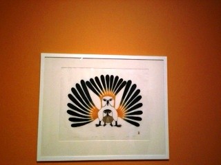 L’exposition fait la part belle à des dessins et gravures de l’artiste qui a vécu à Cape Dorset, au Nunavut, berceau de l’art inuit au Canada. J’y ai notamment appris que la plupart des dessinateurs-peintres inuit laissaient carte blanche aux graveurs pour décider des couleurs. comme si le dessin terminé, l’œuvre n’appartenait plus à son créateur mais laissait toute la place au suivant pour réaliser la gravure et la colorer à sa guise, ce qui me semble assez unique au monde !