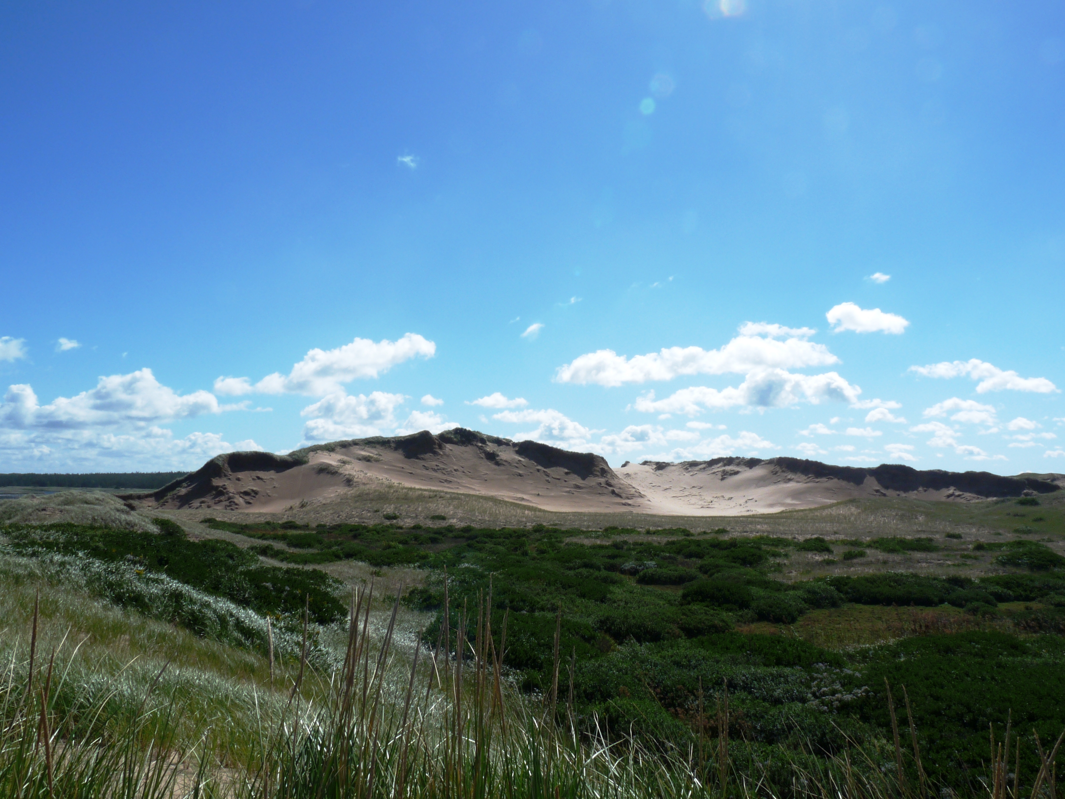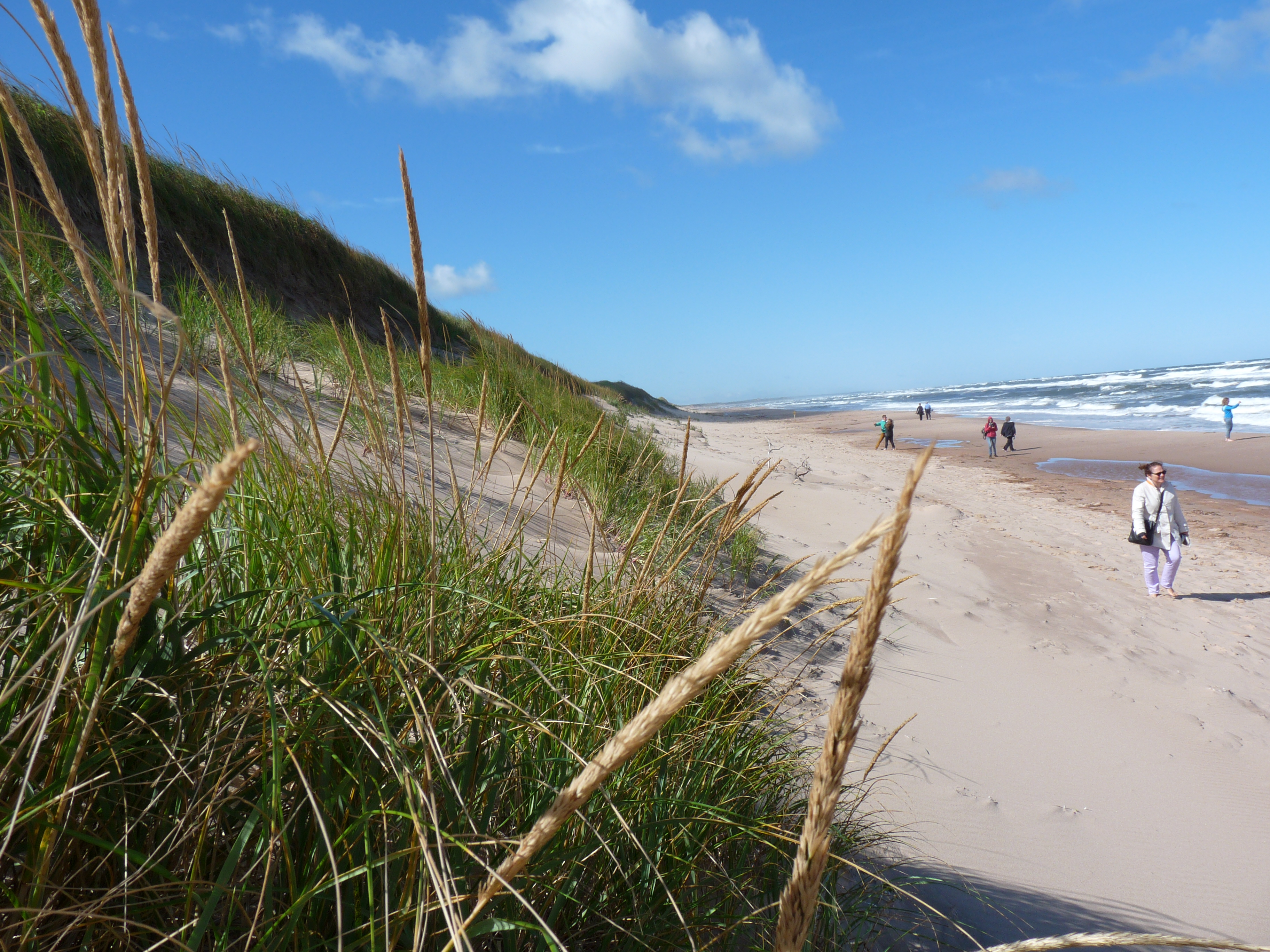 D’une terrasse d’observation au bout du trottoir de bois, on embrasse la vue sur l’étang et les dunes secondaires, dont une dite parabolique à cause de sa forme en croissant. À l’arrière de la plage, ces dunes, comme des rubans de contre-crêtes végétalisées ont voyagé et continuent de se déplacer lentement à l’intérieur des terres. Passé le cordon littoral, tout en touffes d’ammophile à ligule, la longue plage de Greenwich s’étend à perte de vue. Le vent souffle fort sur les dunes comme en mer, avec de bonnes vagues. Le vent est frais et il faut marcher pour ne pas avoir froid. On peut aussi faire le tour de la péninsule à pied par la plage mais non durant l’été car le parc veut protéger les pluviers siffleurs, espèce en danger, au moment de la nidification.